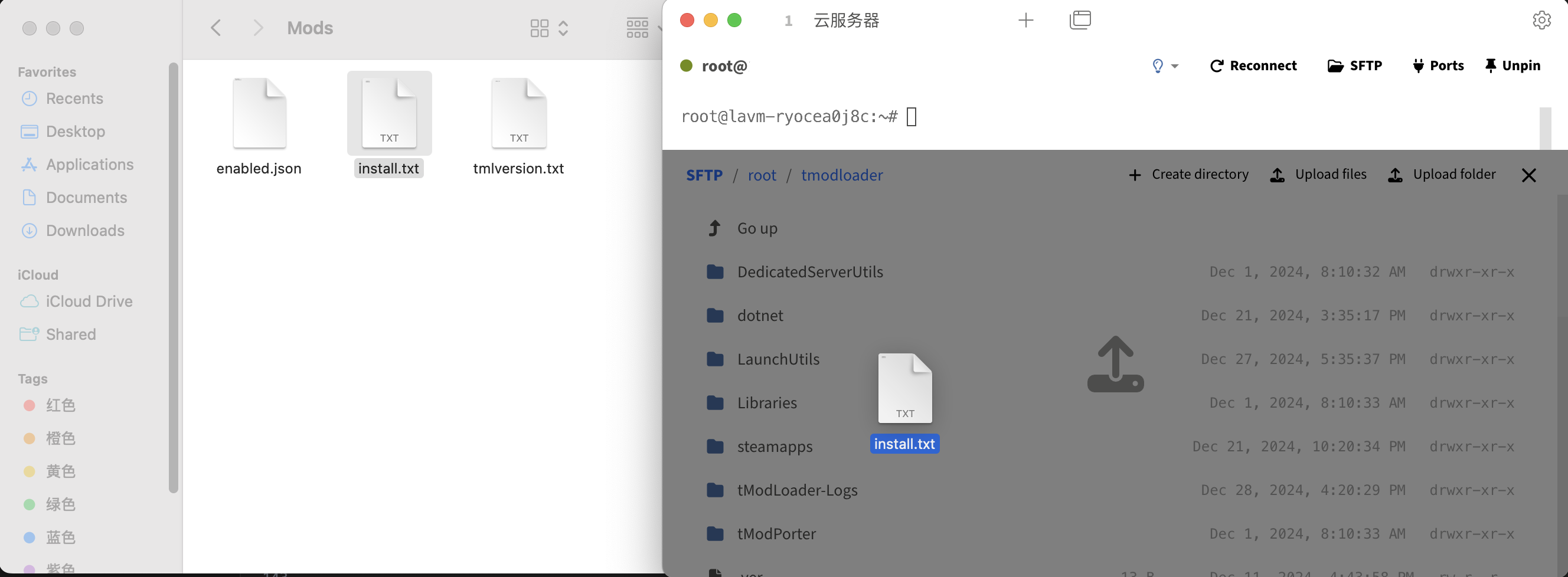 使用SFTP工具(我这里使用的是Tabby自带的SFTP上传工具),将install.txt上传到云服务器的tModLoader目录中
