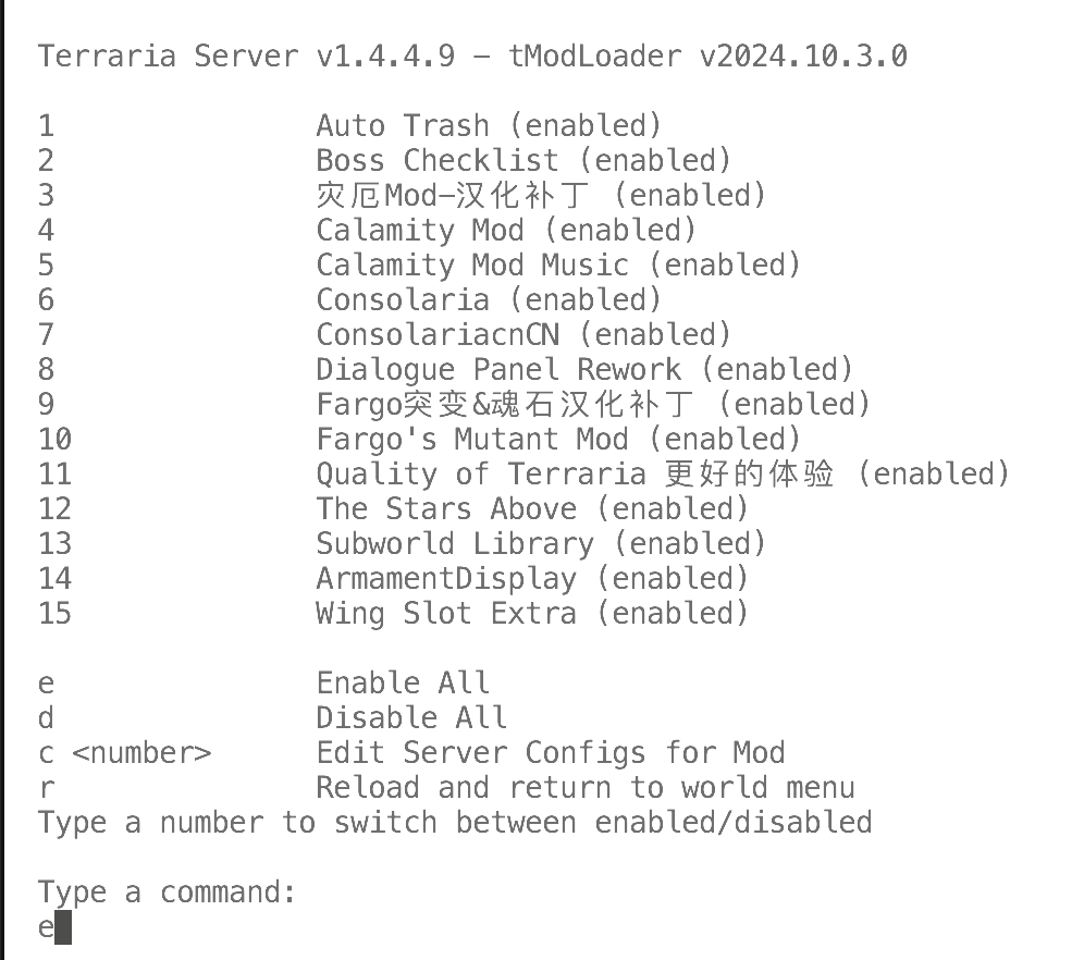 输入e(启用全部模组)回车,再输入r(重新加载模组并且回到主界面)