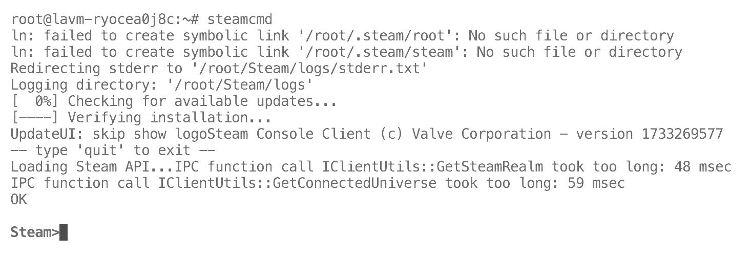 输入steamcmd,尝试运行steamcmd,成功后输入exit退出